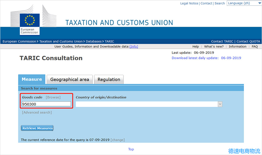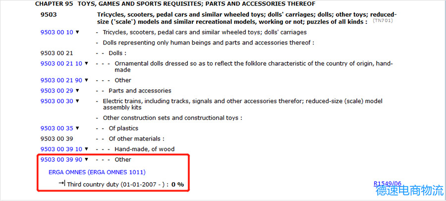 打開TARIC CONSULTATION 官網: http://ec.europa.eu/taxation_customs/dds2/taric/taric_consultation.jsp,輸入前六位950300定位(因為歐盟的海關編碼和稅率一樣,所以Country of origin/destination可不填)